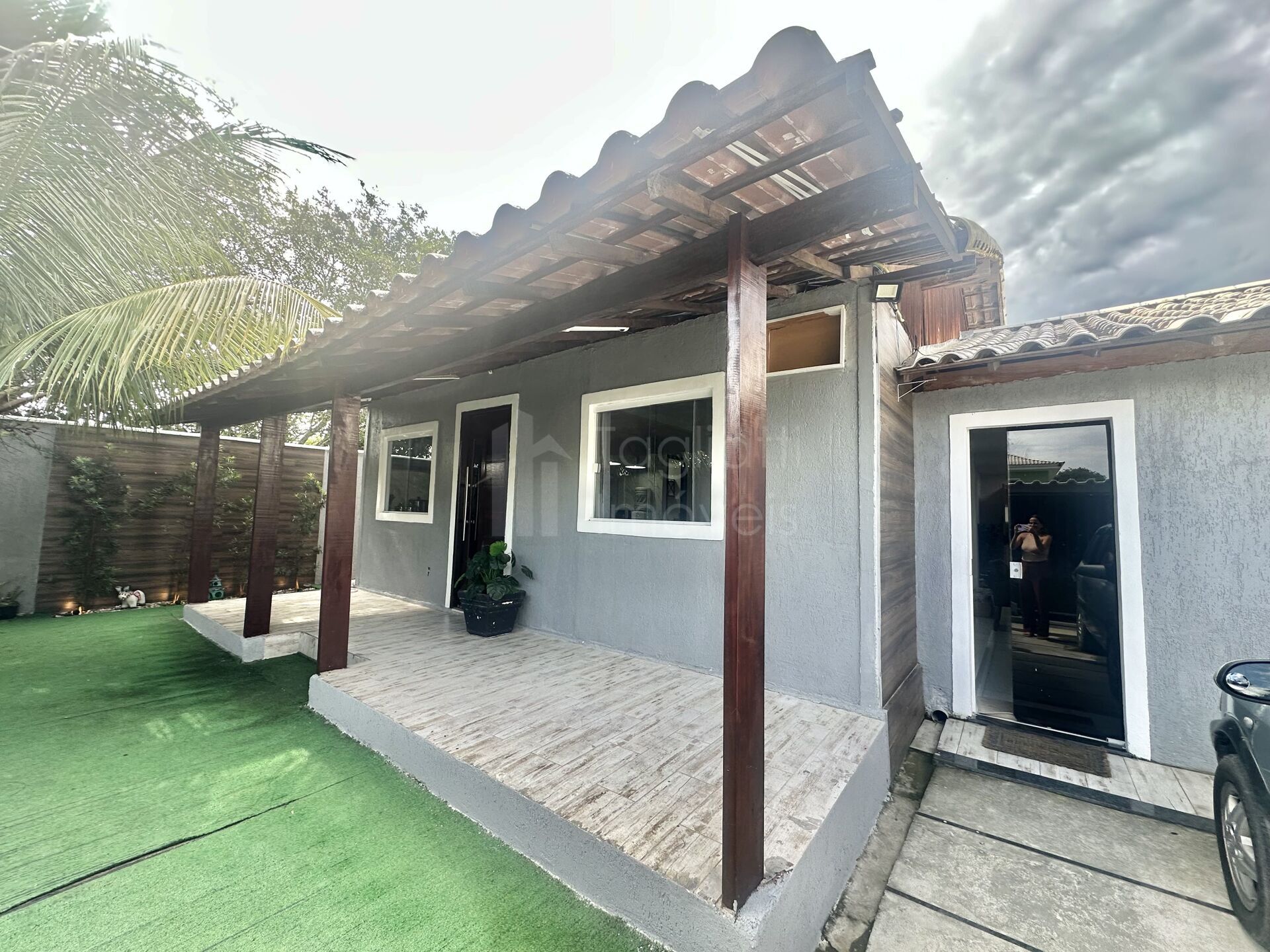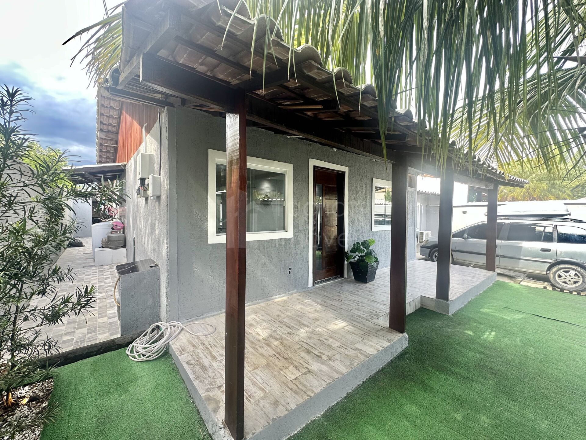 Quintal com piscina, pergolado, balanço, área gourmet com sinuca e churrasqueira, chuveirão, lavanderia externa, quartinho de bagunça, corredor e garagem para 1 carro.