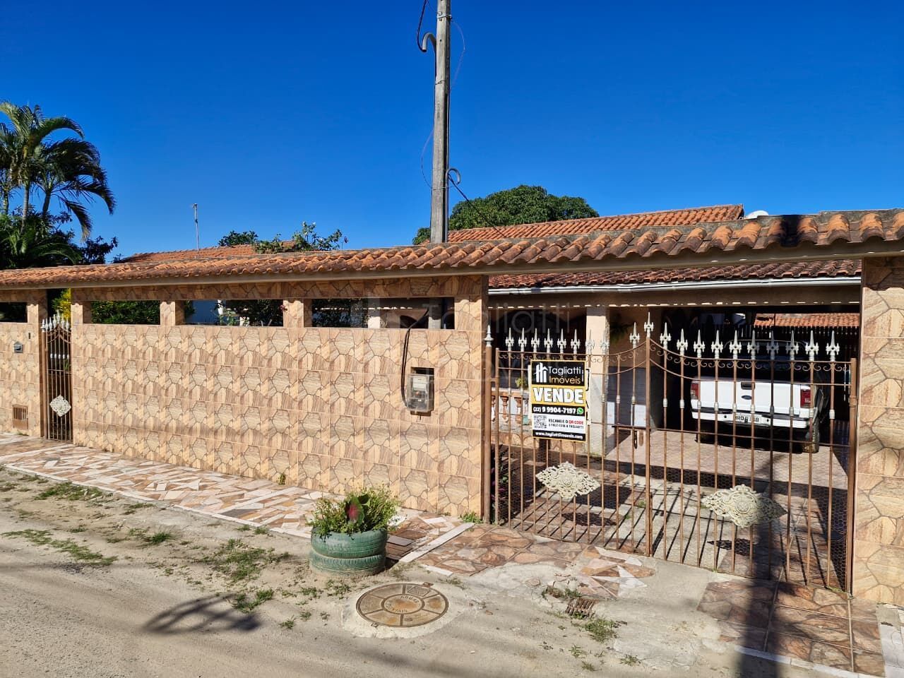 Possui muros laterais e frontais, filtro, fossa e sumidouro, além de garagem coberta para um carro.